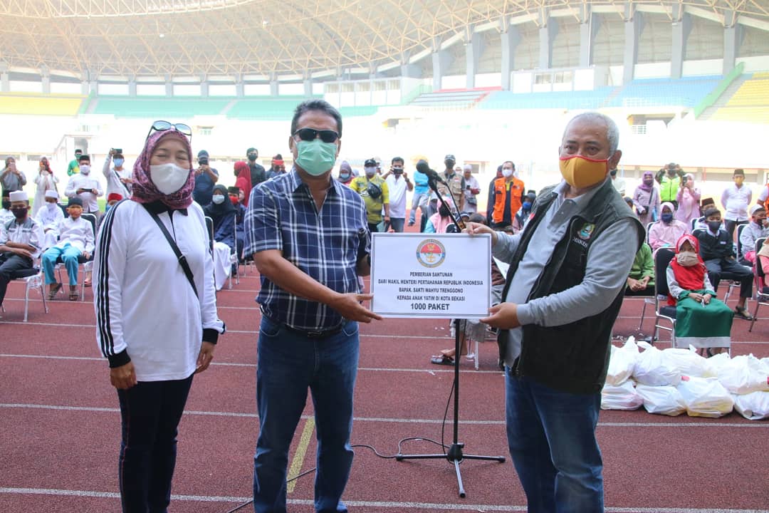 Wamenhan Trenggono yang didampingi anak dan istrinya, menyalurkan bantuan itu di Stadion Patriot Chandrabaga. Wali Kota Bekasi Rahmat Effendi mengaku, sangat mengapresiasi niat tulis Wamenhan dan istri.
