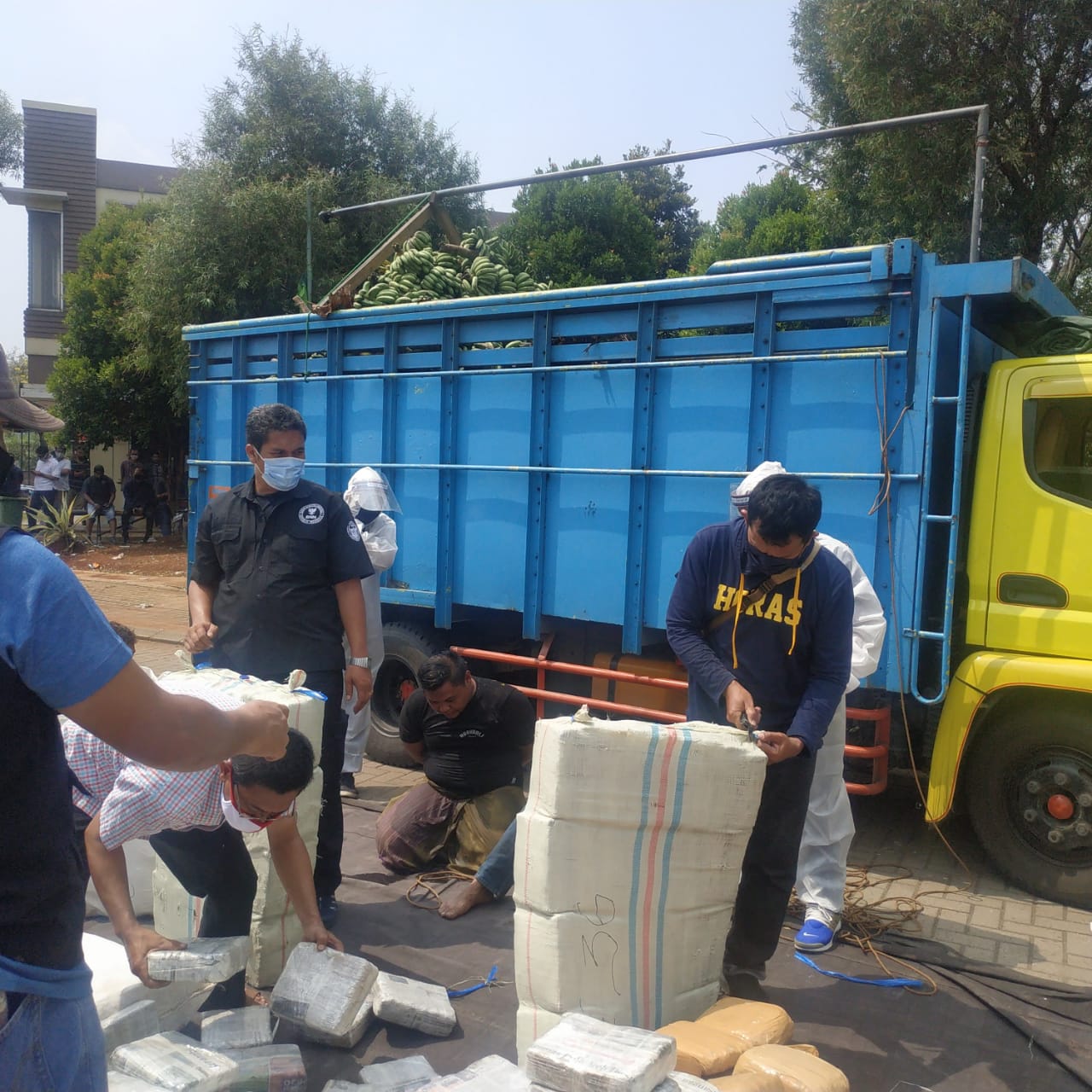 Ratusan kilogram narkotika jenis ganja berhasil diamankan Badan Narkotika Nasional (BNN) di Kawasan Perumahan Pesona Metropolitan Kota Bekasi, Senin 10 Agustus 2020. Seluruh barang haram itu disembunyikan di dalam truk bermuatan pisang.