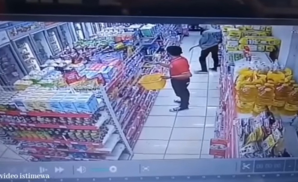 Dalam rekaman CCTV itu memptertontonkan dua orang di dalam minimarket. Satu orang menggunakan sweeter sambil memegang celurit dan satu lagi seorang pegawai minimarket. (put)
